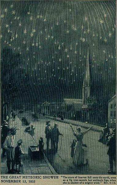 NOTE: Many believe that these signs are yet to come; however, the first signs in the sky occurred at the end of persecution and just prior to the close of tribulation in 1798. On May 19, 1780, the sun was darkened and that same night the moon appeared as blood. (Actually notes from that day). Then on November 13, 1833, the heavens seemed ablaze as the greatest meteoric shower ever to be recorded was observed over North America. Meteors were falling at a rate of 60,000 per hour.